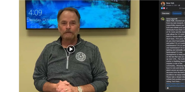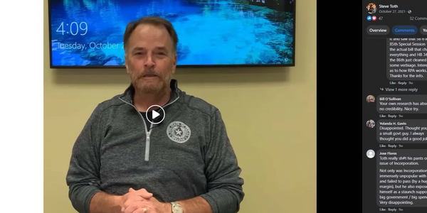 Hello, I'm Texas State Representative Steve Toth and I want to talk to you about Incorporation. I moved my family to The Woodlands in 1997. I love it here. In regards to incorporation, the question is really simple. If you want government of big business, for big business, by big business, then vote against incorporation. I get it.
